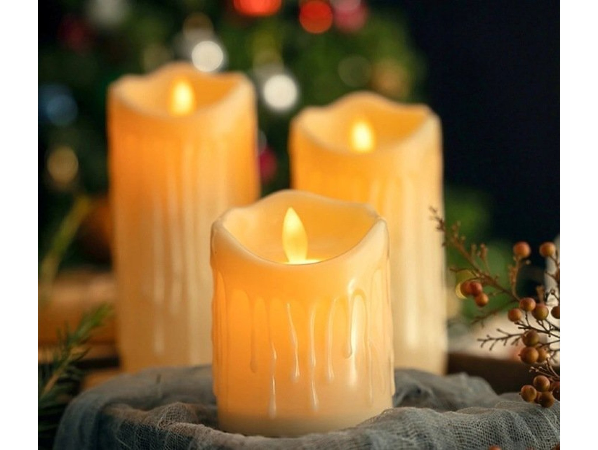 Jej wygląd inspirowany jest tradycyjnymi świecami – imitacja kapiącego wosku i delikatne, ciepłe światło tworzą przytulny nastrój, który nadaje wyjątkowy charakter każdej aranżacji. W zestawie znajdują się trzy świece w różnych rozmiarach, co pozwala na kreatywne komponowanie dekoracji, od świątecznych stroików po romantyczne ustawienia na stole.