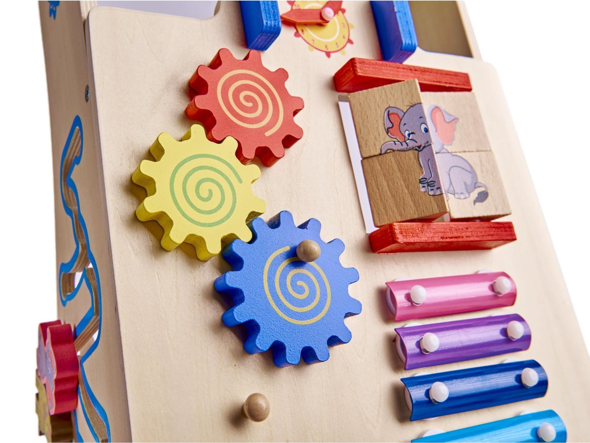 ✅ Rozwój zdolności manualnych – interaktywne elementy, takie jak sorter, cymbałki, liczydło czy labirynt, doskonale rozwijają zdolności manualne i poznawcze dziecka, ucząc go cierpliwości, precyzji i rozpoznawania kolorów.