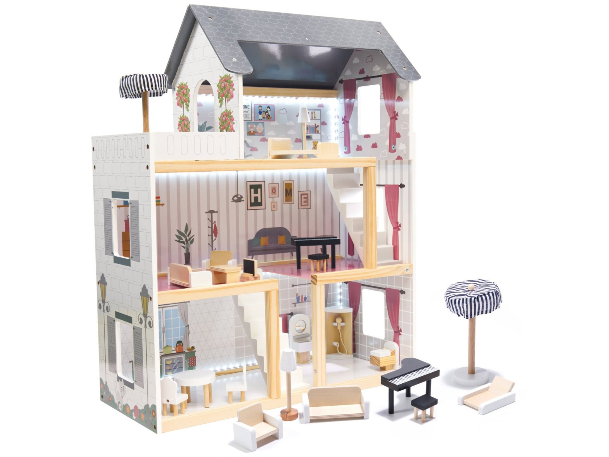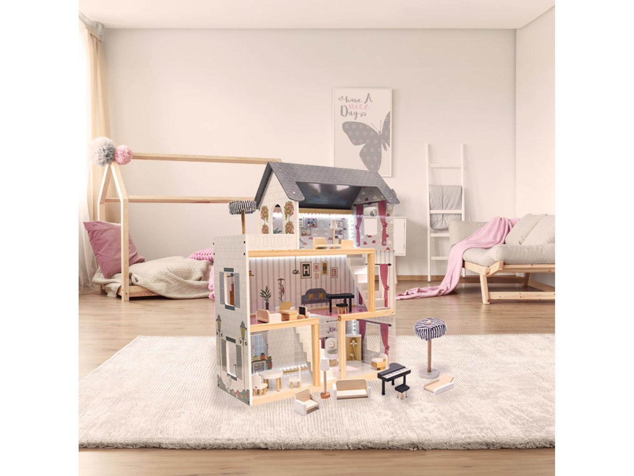 Przedstawiamy domek dla lalek, który jest czymś więcej niż zwykłą zabawką – to prawdziwe centrum kreatywności, które pozwala na godzinne zabawy w urządzanie wnętrz, tworzenie historii i rozwijanie wyobraźni. Domek dla lalek z mebelkami i oświetleniem LED to połączenie funkcjonalności, estetyki i trwałości, które zachwyci zarówno dzieci, jak i dorosłych miłośników miniaturowych aranżacji. Z 4 pomieszczeniami rozmieszczonymi na 3 piętrach – kuchnią, łazienką, sypialnią i salonem, domek zapewnia mnóstwo przestrzeni do zabawy. Oprócz tego, otwarty taras stanowi dodatkową przestrzeń do kreatywnych zabaw.