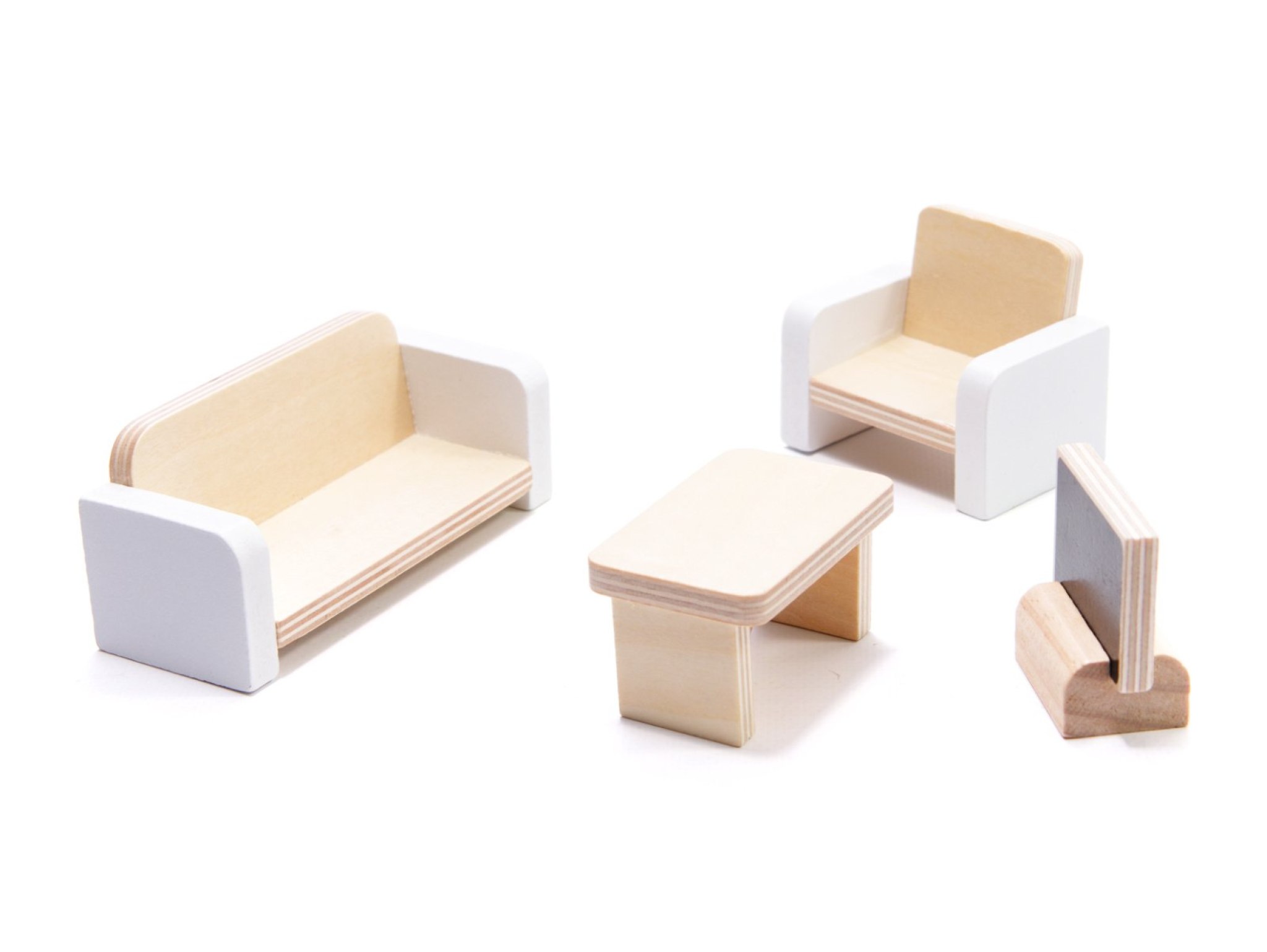 - Meble (16szt.): stół, krzesełka, łóżko, lampka, fotel, kanapa, stolik kawowy, telewizor, fortepian, ława, leżak, parasol, prysznic, umywalka, toaleta.