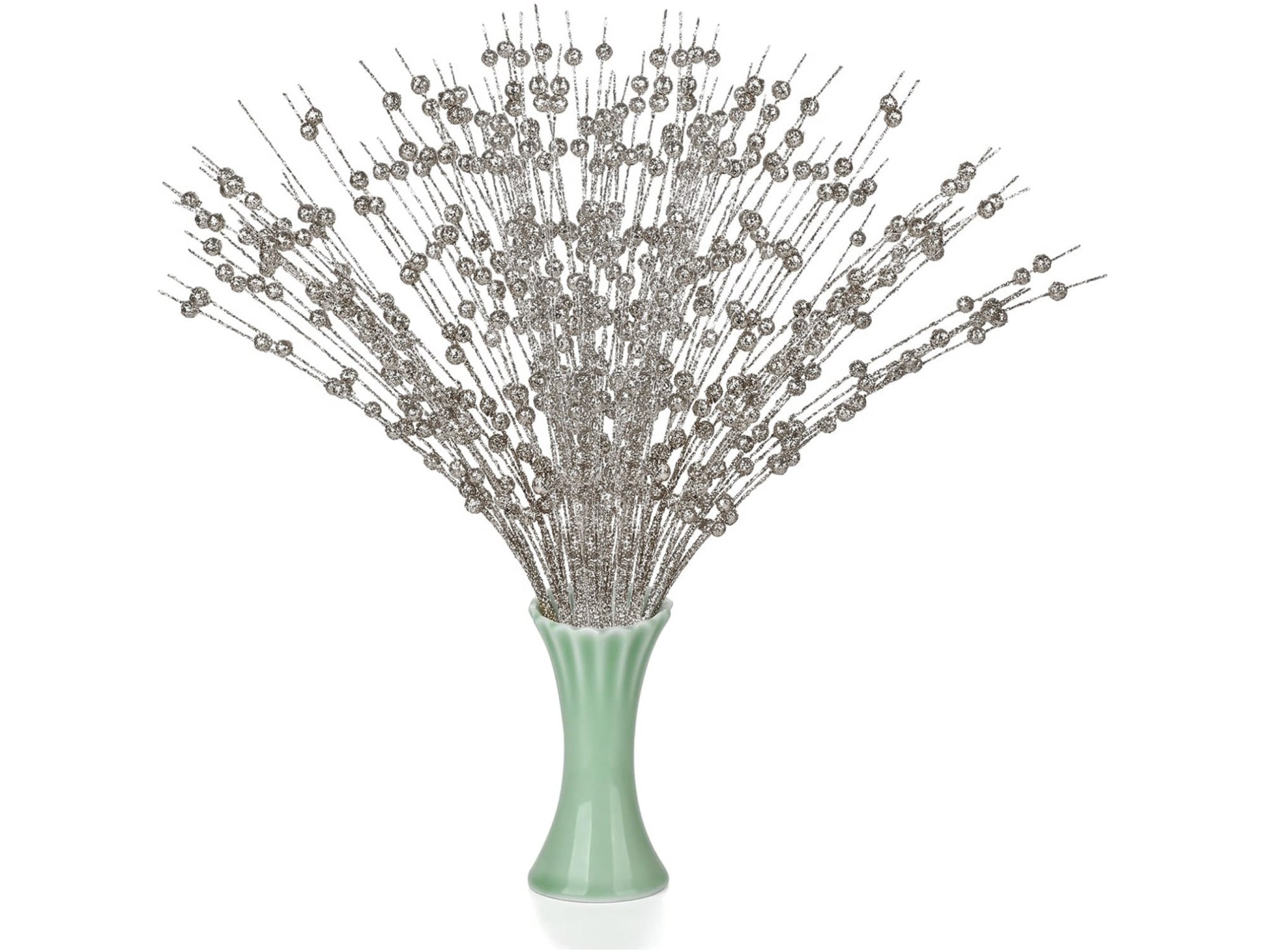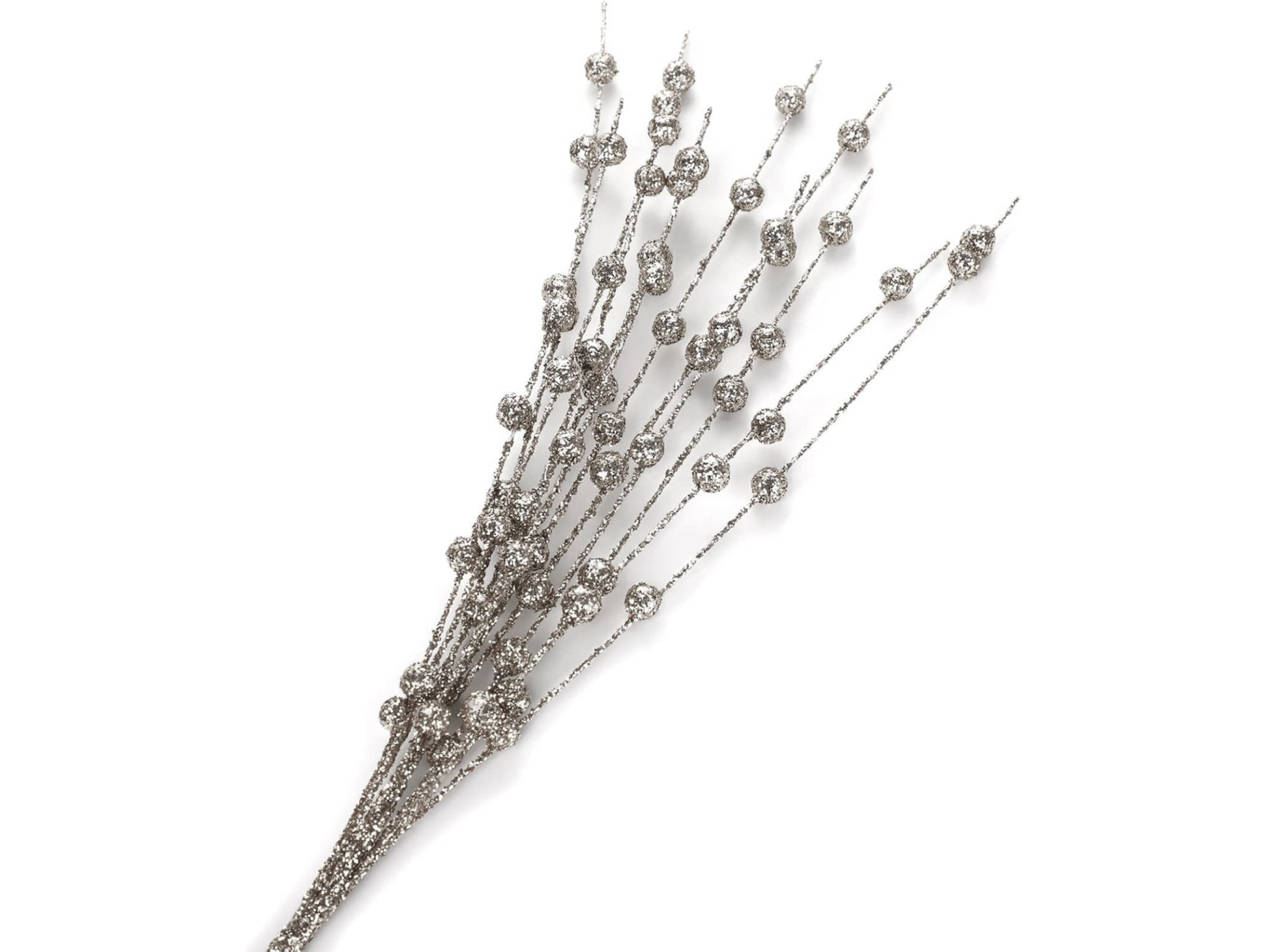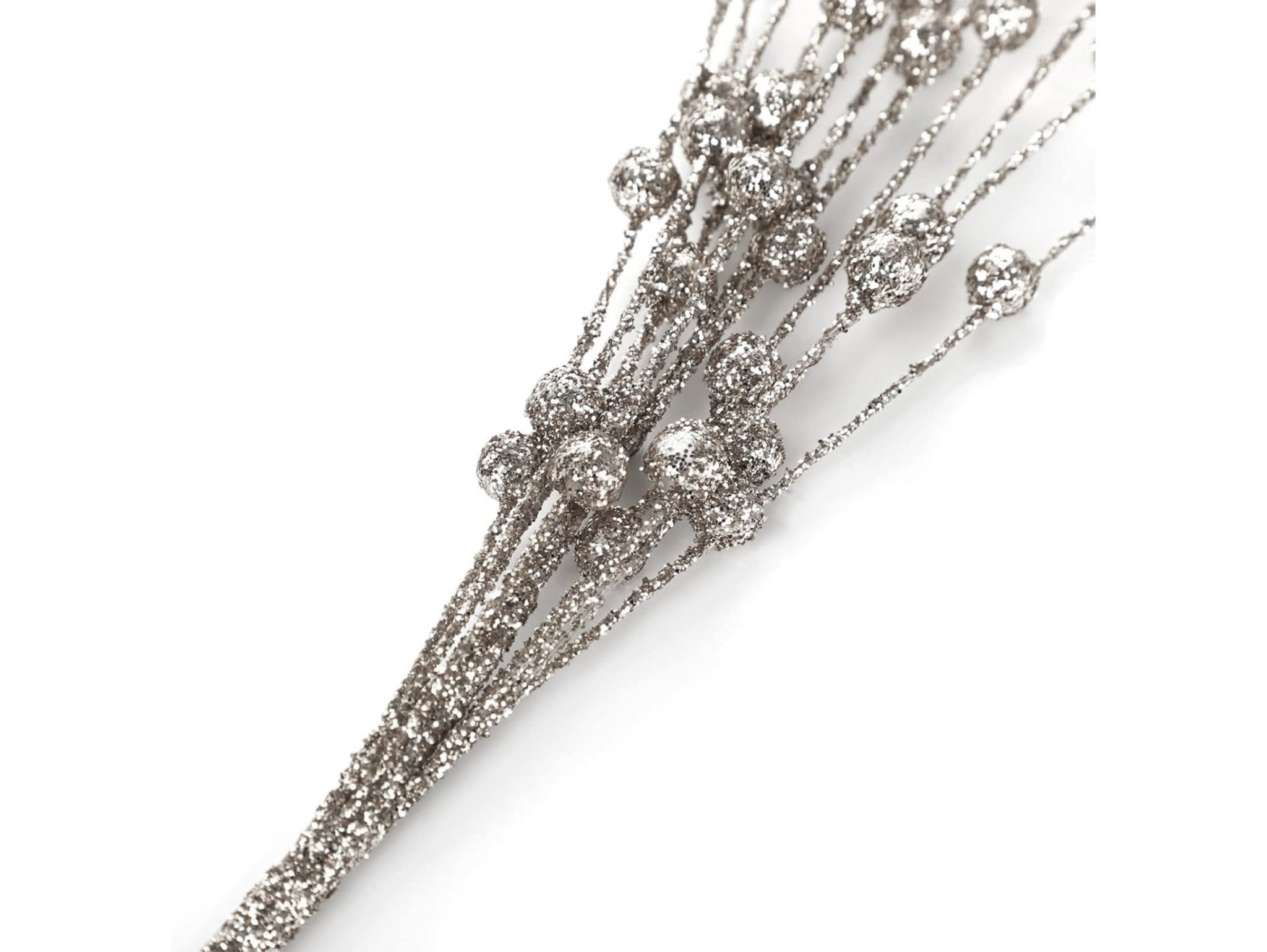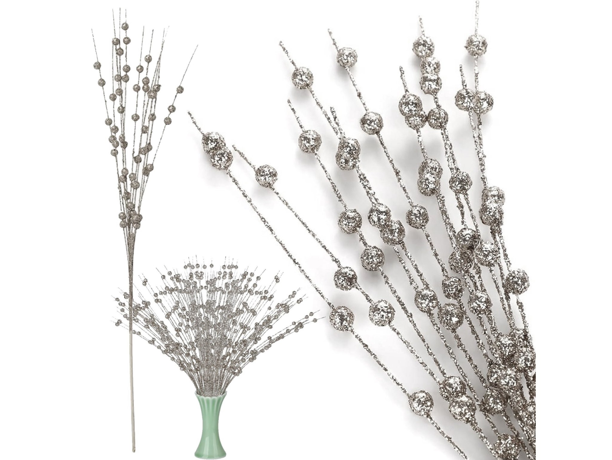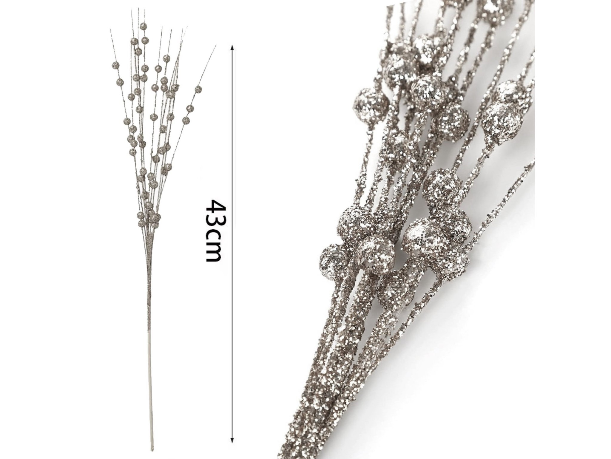 Dodaj blasku i wyjątkowego uroku swoim dekoracjom dzięki świątecznej gałązce dekoracyjnej, która perfekcyjnie sprawdzi się w stroikach, bukietach, wiankach czy innych aranżacjach świątecznych. Ozdobiona brokatowymi kulkami, wprowadza do wnętrza elegancję, przytulność i magiczny klimat Bożego Narodzenia.