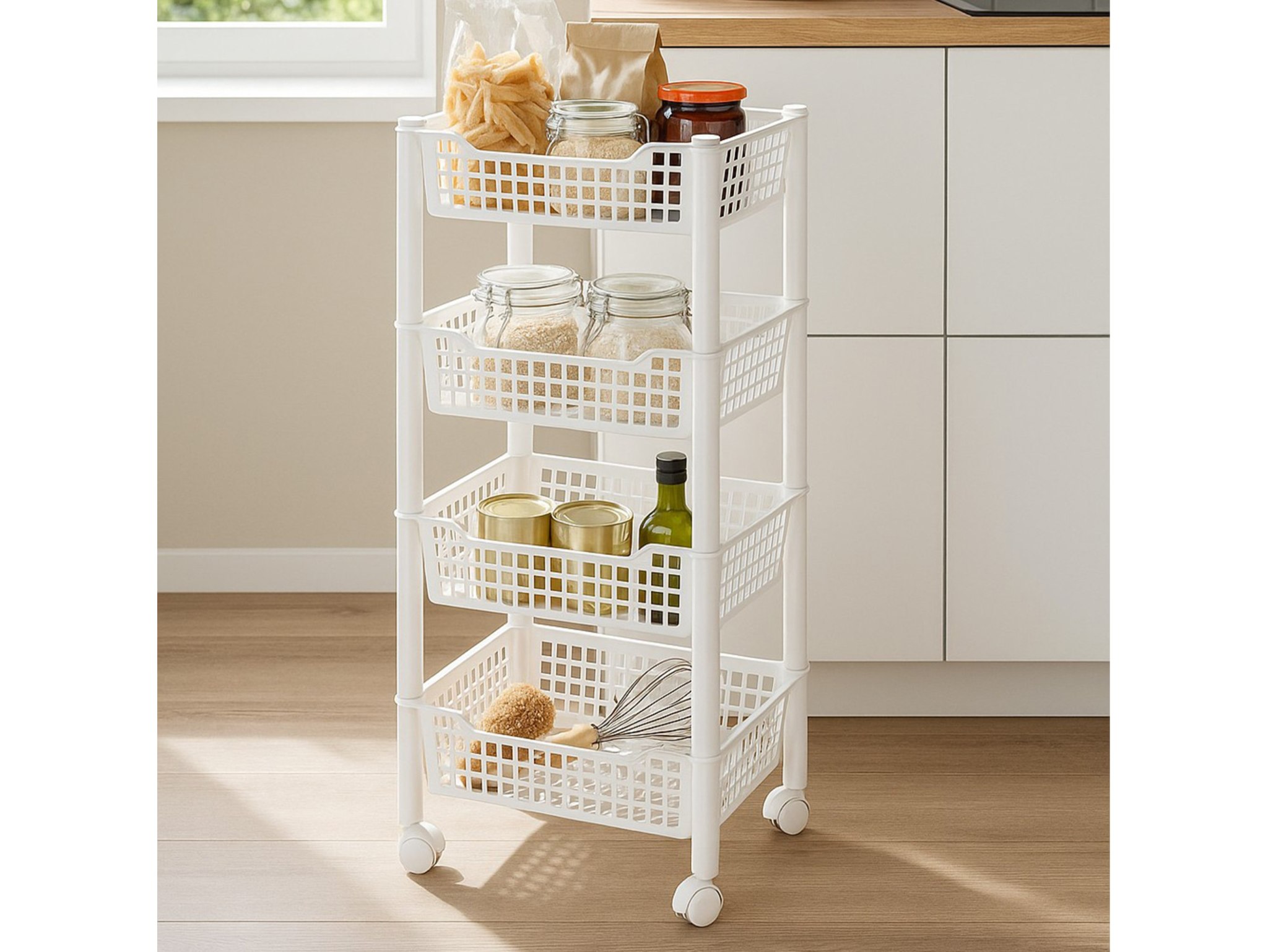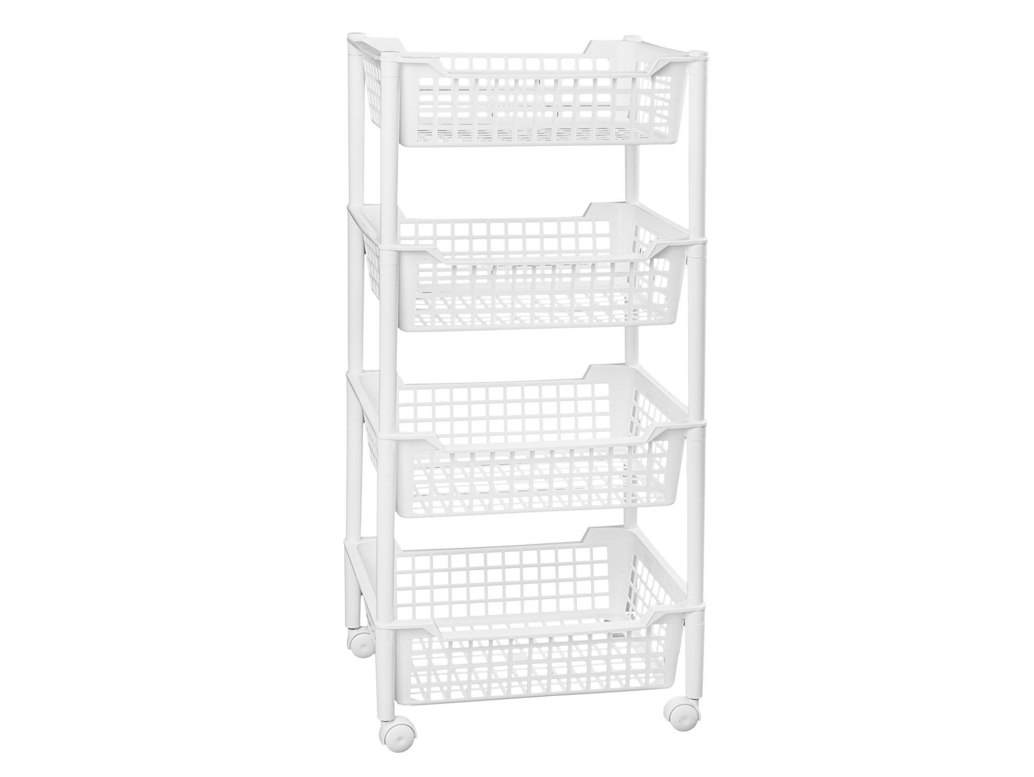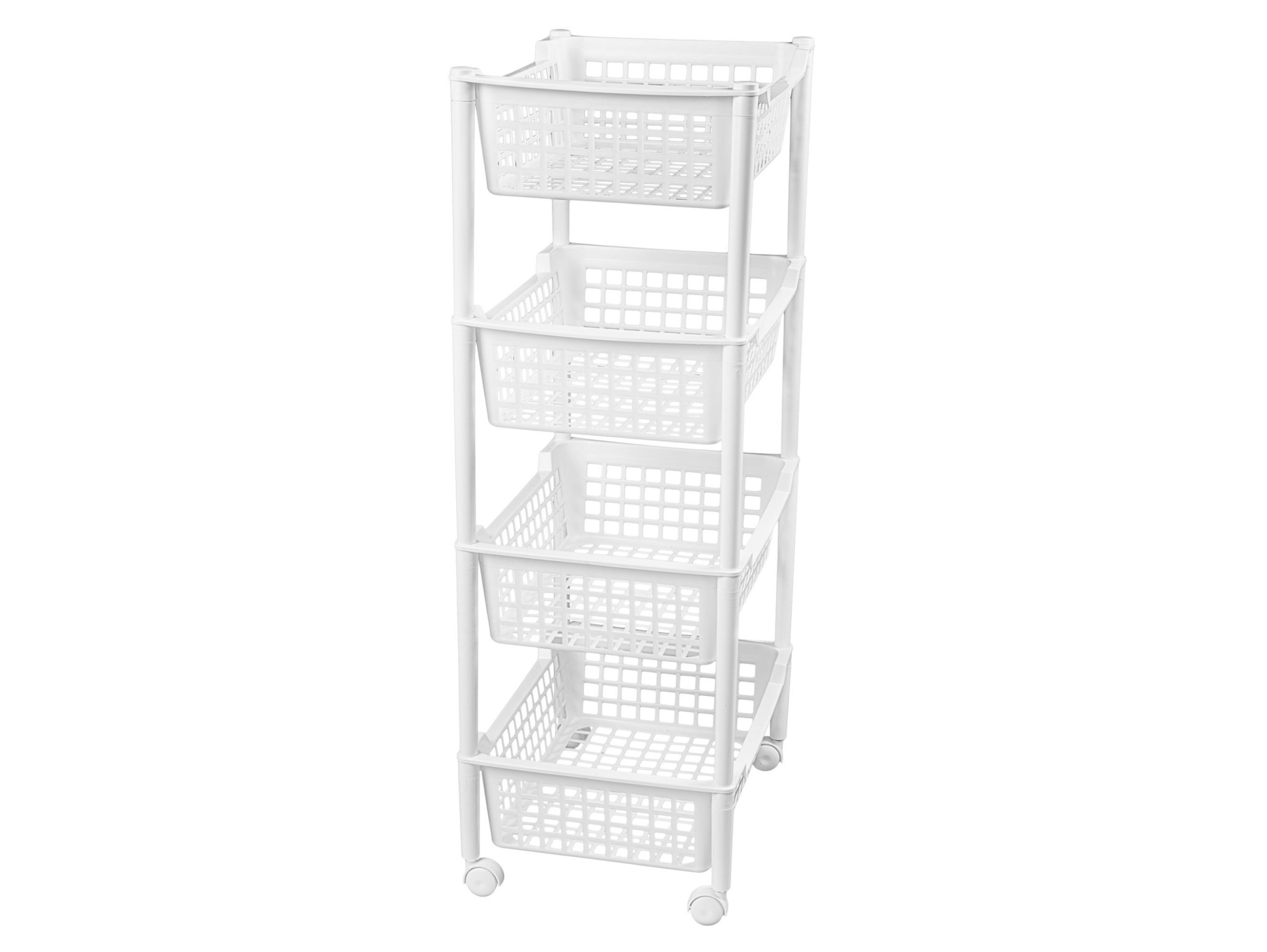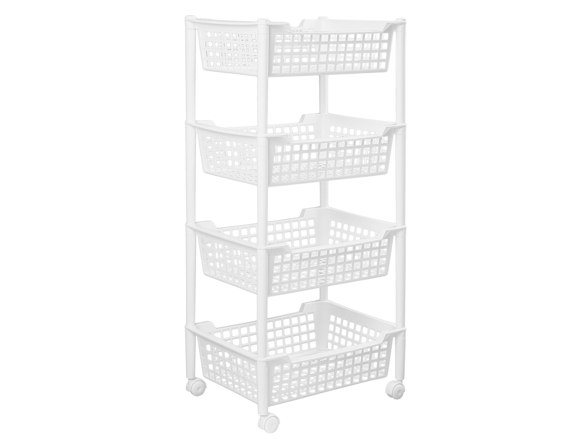 Regał wykonano z plastiku premium o sztywnych, grubych ściankach, który nie rdzewieje i łatwo utrzymać go w czystości. Cztery głębokie kosze zapewniają świetną wentylację przechowywanych produktów i pozwalają mieć wszystko zawsze pod ręką. Obrotowe kółka umożliwiają manewrowanie jedną ręką, nawet w wąskich przestrzeniach, a kompaktowe wymiary sprawiają, że regał zmieści się tam, gdzie klasyczne meble nie wchodzą.