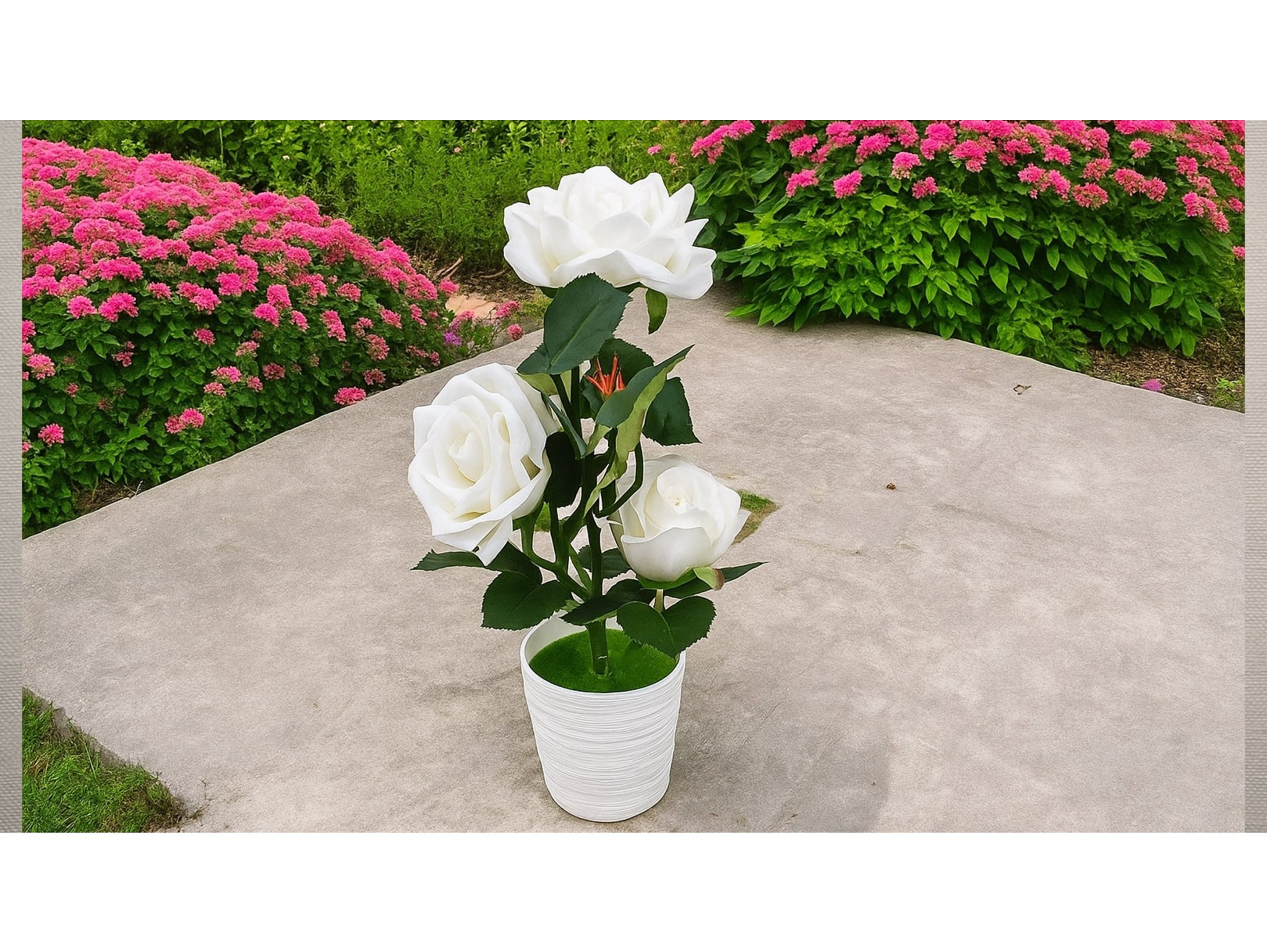 Wyjątkowa sztuczna róża XXL o wysokości 38 cm z trzema realistycznymi kwiatami w doniczce to doskonała dekoracja, która wprowadzi do Twojego wnętrza odrobinę klasy i stylu. Dzięki perfekcyjnemu odwzorowaniu naturalnych kwiatów róża wygląda jak żywa, zachwycając swoim pięknem przez cały rok.