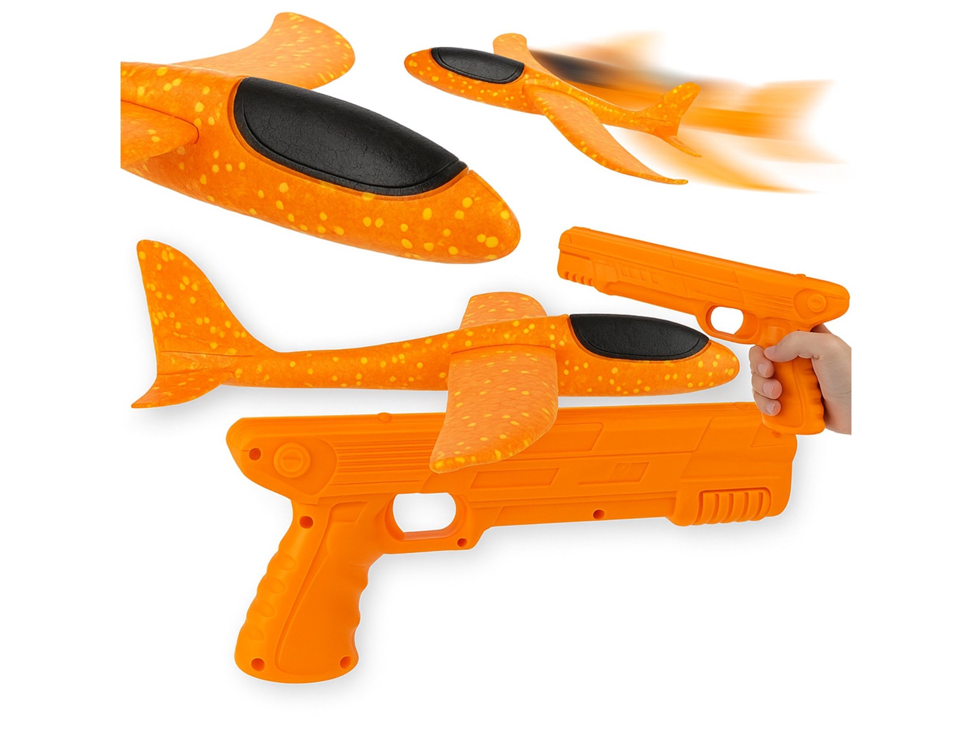 Spektakularne loty z wyrzutnią – Samolot może być wypuszczany w przestworza za pomocą pistoletu – wyrzutni, załączonej w zestawie. Wystarczy umieścić samolot w odpowiednim miejscu, naciągnąć i strzelić! Dzięki temu poleci zdecydowanie dalej i bardziej spektakularnie niż puszczany z ręki. Pistolet wykonany z mocnego tworzywa sztucznego. 🚀🔫