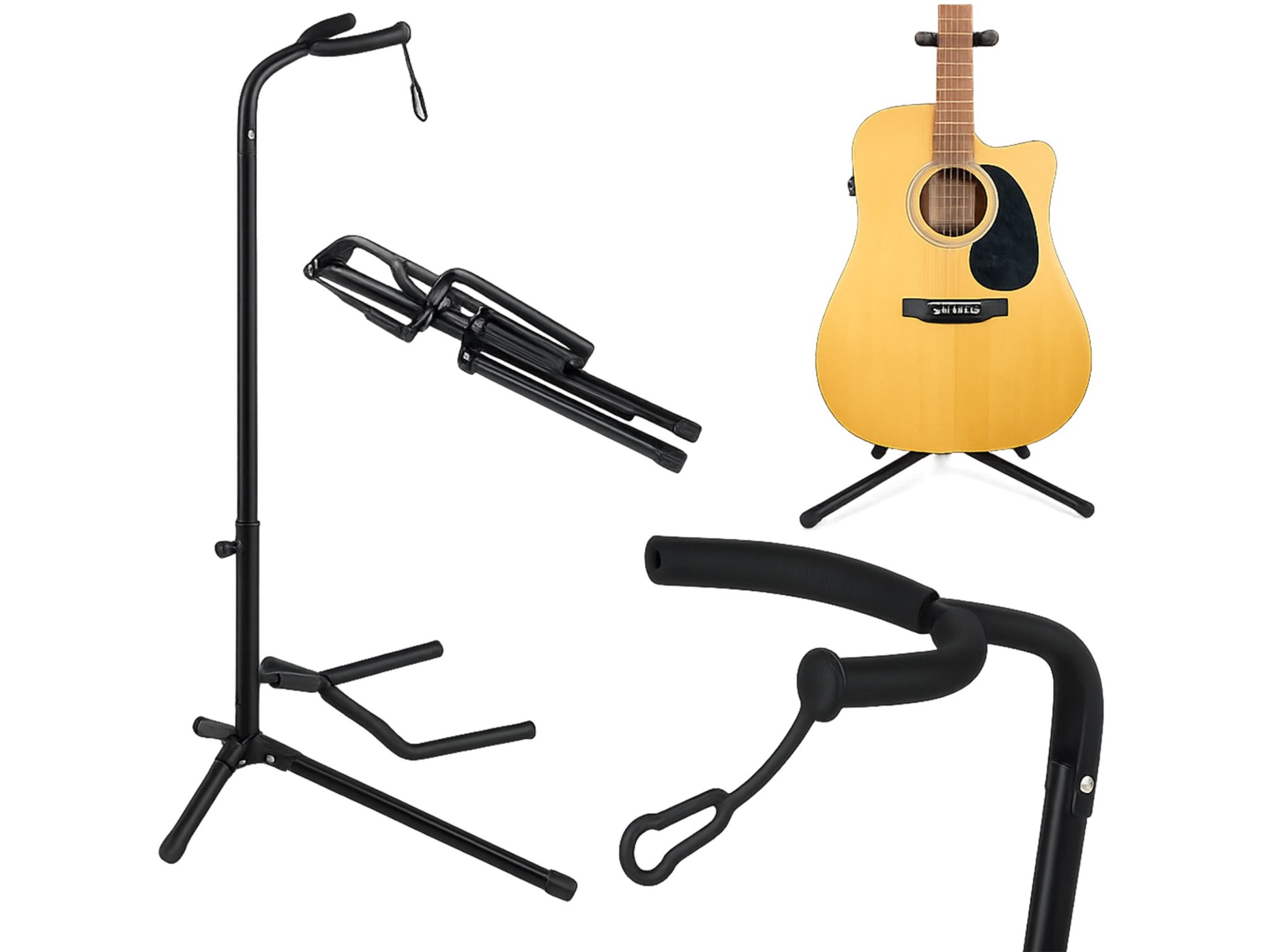 Statyw został zaprojektowany tak, aby zapewnić maksymalną stabilność, eliminując ryzyko przewrócenia się gitary. Miękkie elementy ochronne zapobiegają zarysowaniom i uszkodzeniom lakieru, a specjalna blokada na gryf utrzymuje gitarę w bezpiecznej pozycji.