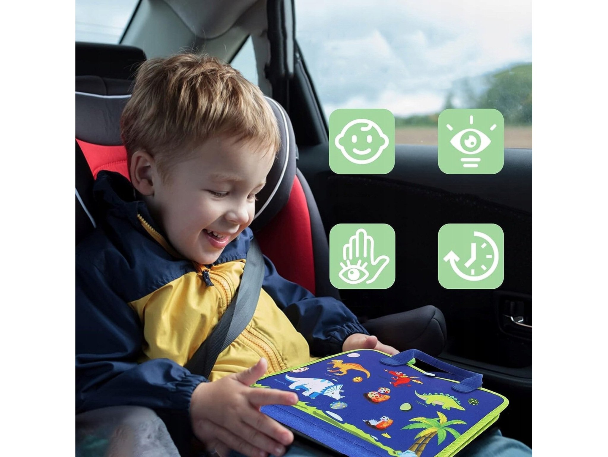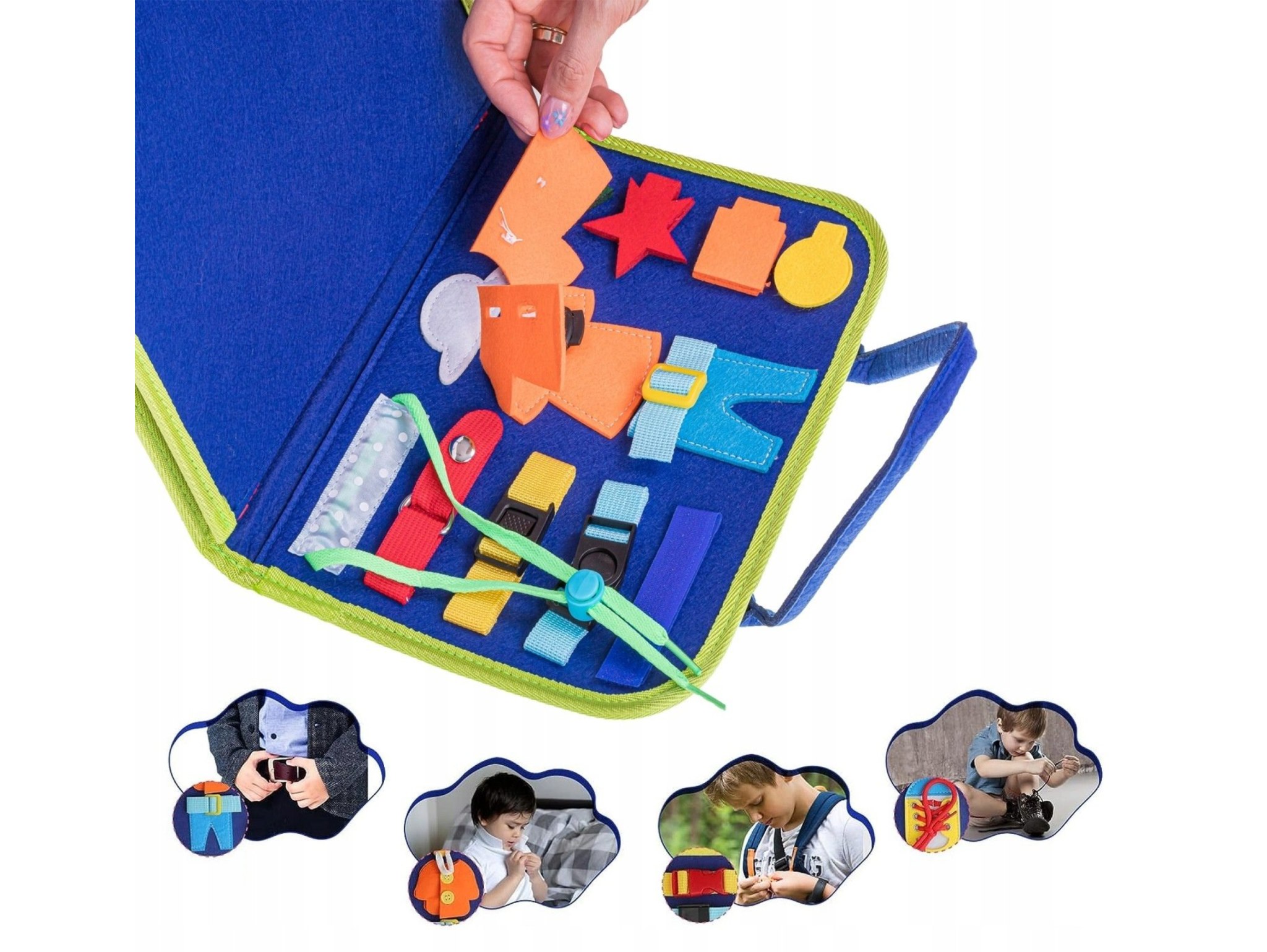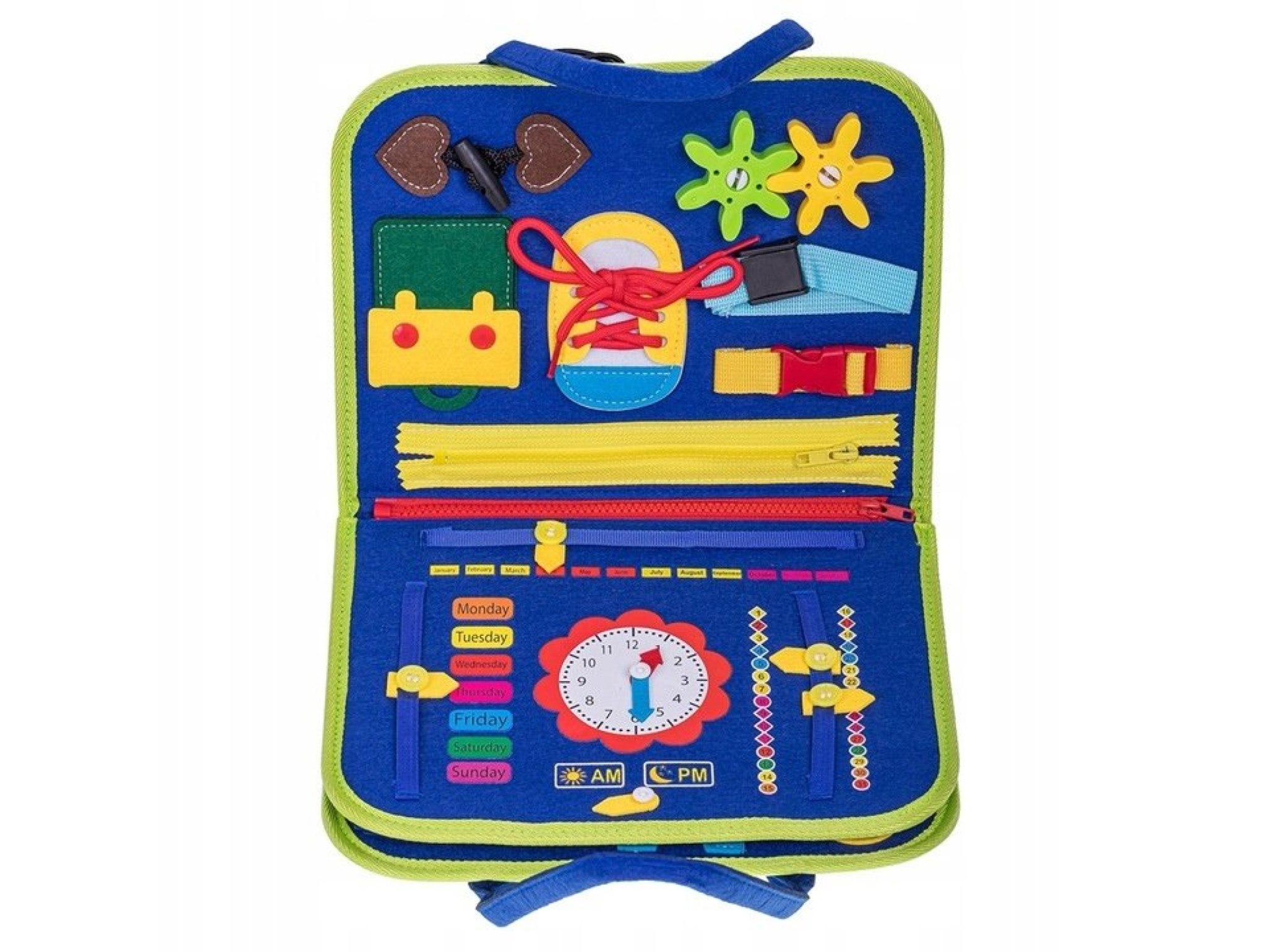 Co ją wyróżnia? Tablica ma formę filcowej książeczki, co czyni ją wyjątkowo praktyczną i poręczną. Idealnie sprawdzi się nie tylko w domu, ale również w podróży – zmieści się w plecaku, nie zajmuje dużo miejsca i zapewni dziecku długie chwile wartościowej zabawy np. w samochodzie czy samolocie. 🚗✈️