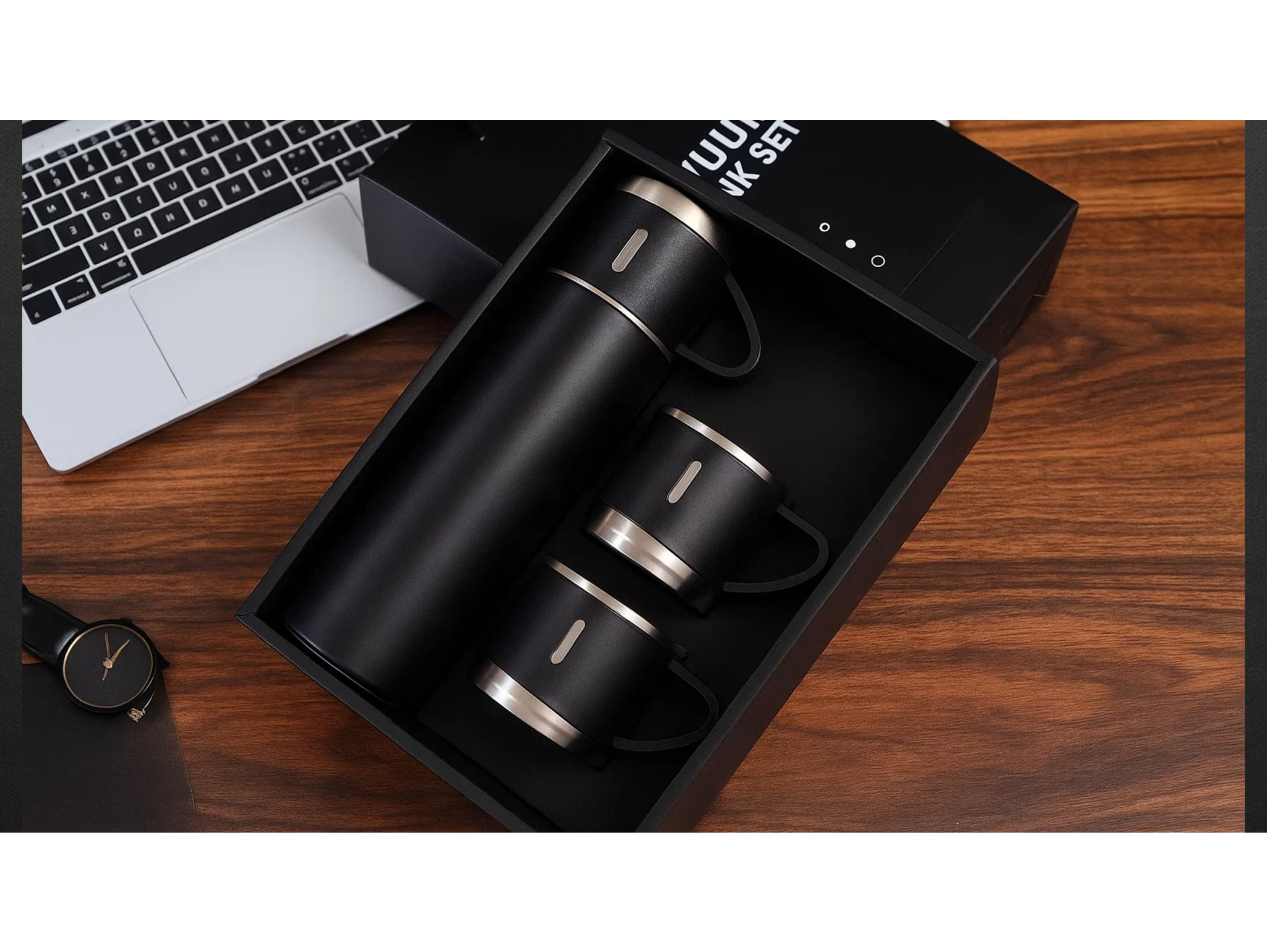 Termos z filiżankami 500ml +3 kubki stal zestaw prezentowy komplet upominek czarny