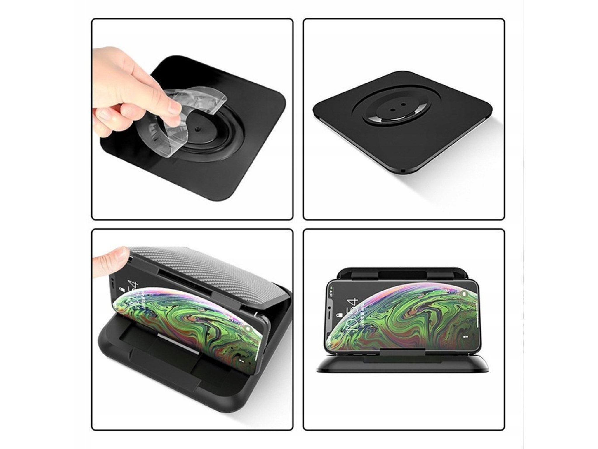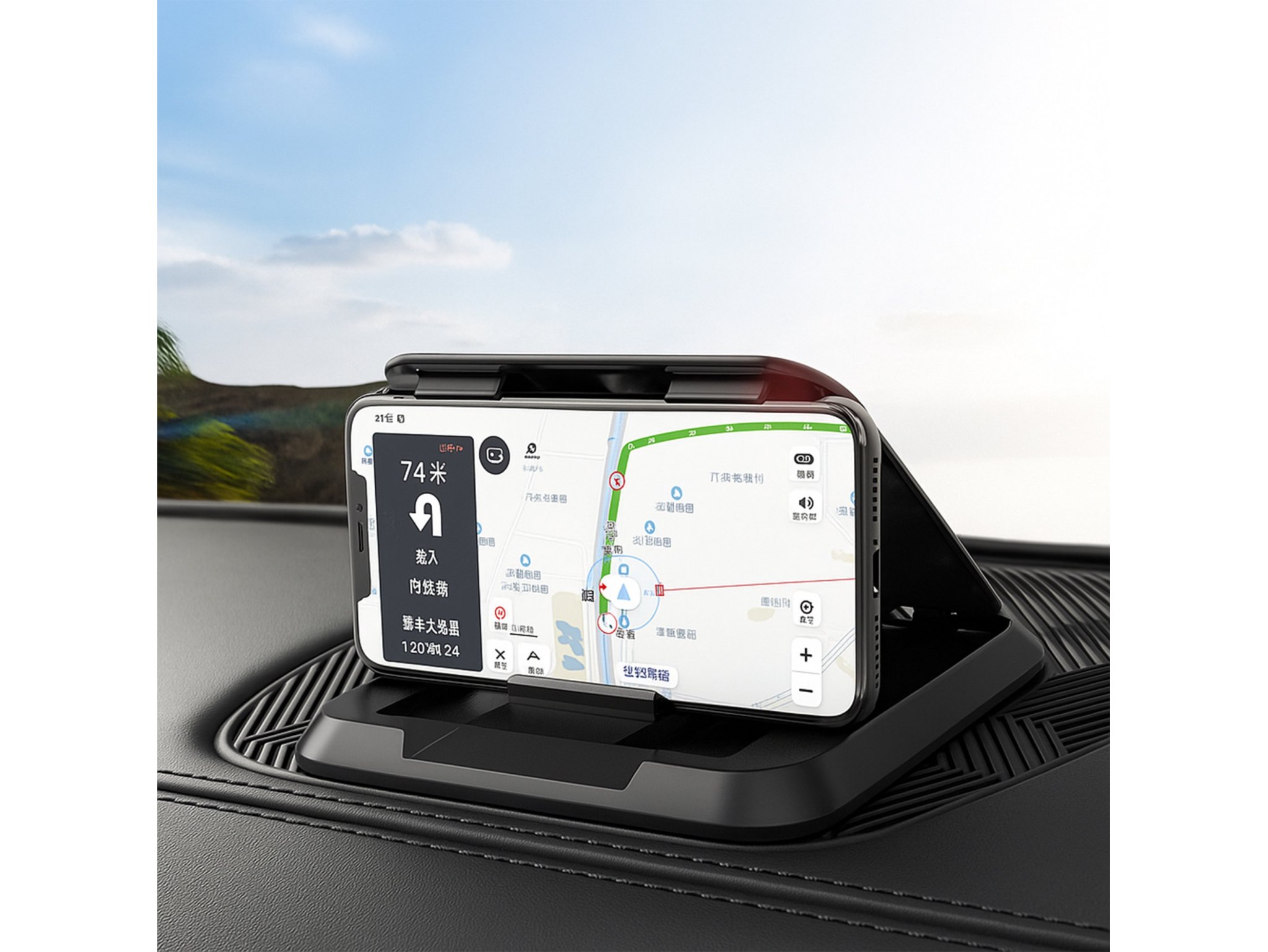 Stabilność i bezpieczeństwo – uchwyt posiada system blokady, który zapobiega przypadkowemu przewróceniu się telefonu. Jego silikonowa podstawa chroni urządzenie i wnętrze pojazdu przed zarysowaniami.