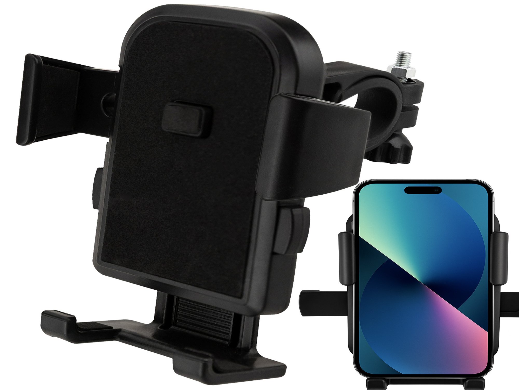 Wykonany z trwałego tworzywa ABS, uchwyt posiada antypoślizgowe wykończenie oraz boczne i dolne ramiona, które solidnie utrzymują telefon nawet na nierównym terenie. Montaż jest prosty i szybki – wystarczy dokręcić śrubę mocującą do kierownicy.🔧