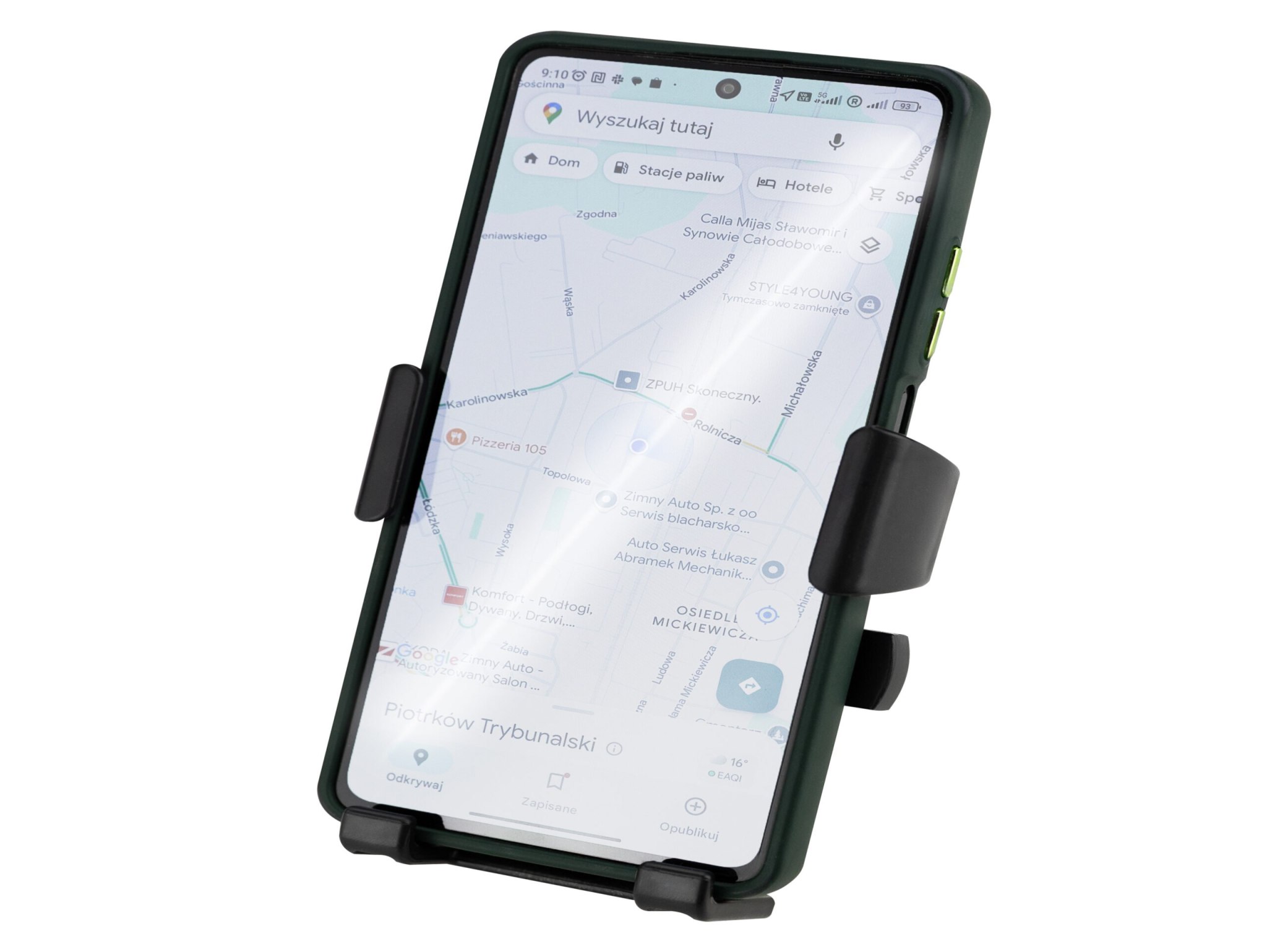 Umożliwia wygodne korzystanie z GPS, odtwarzacza muzyki, aplikacji treningowych czy odbieranie połączeń – bez ryzyka upuszczenia telefonu. Dzięki regulowanej szerokości uchwyt pasuje do większości modeli smartfonów o wymiarach od 6,5 cm do 9,7 cm.