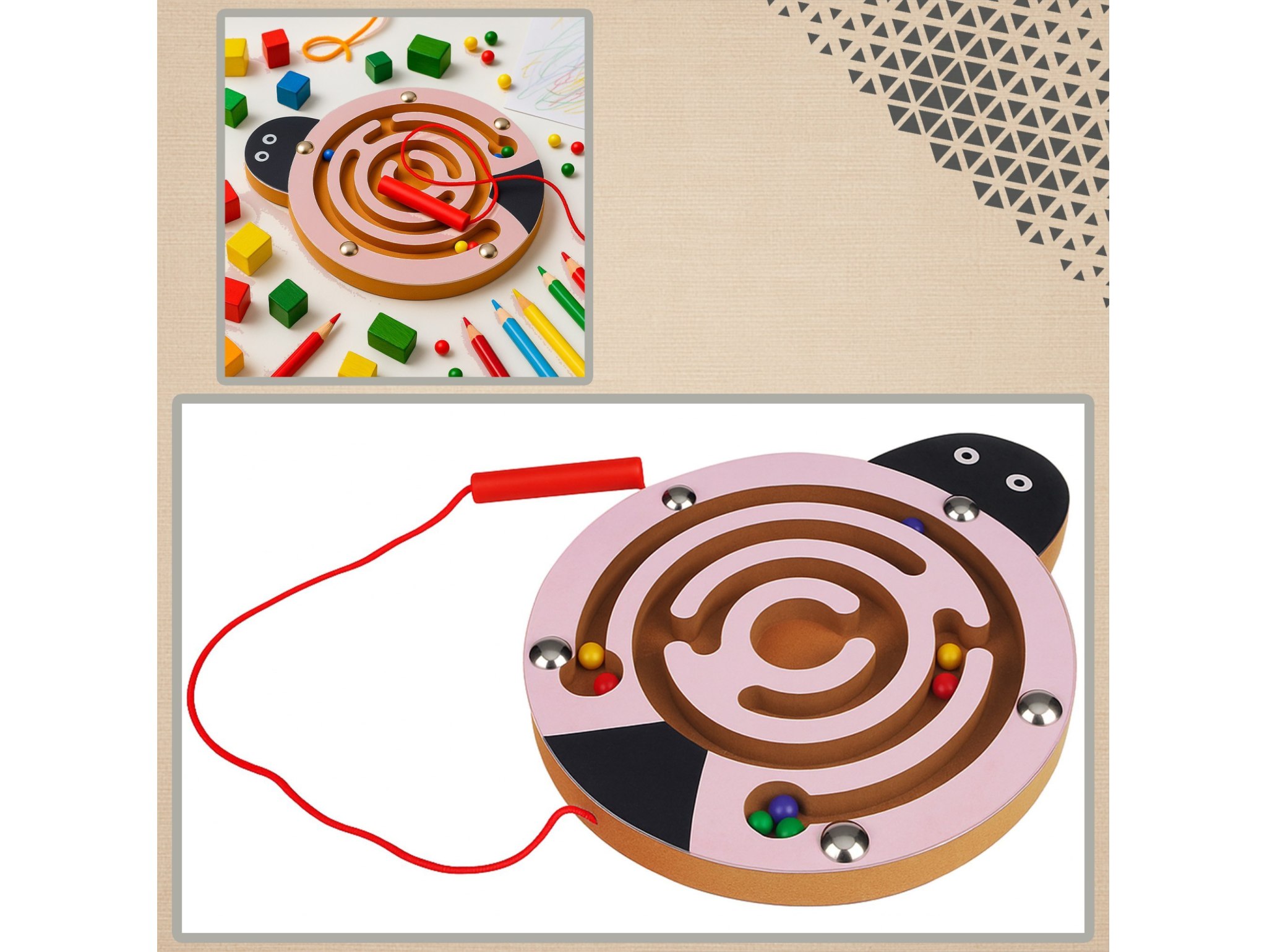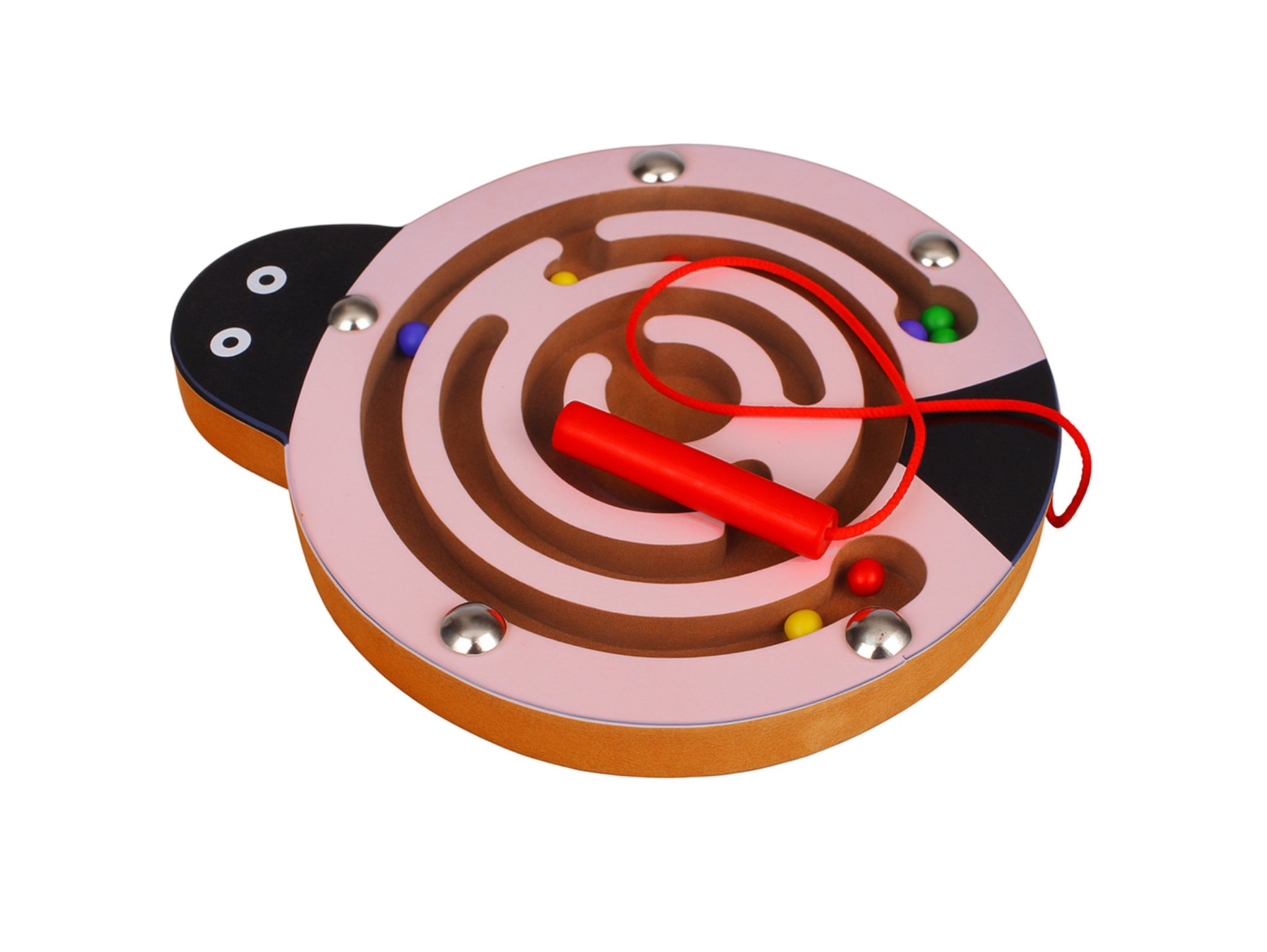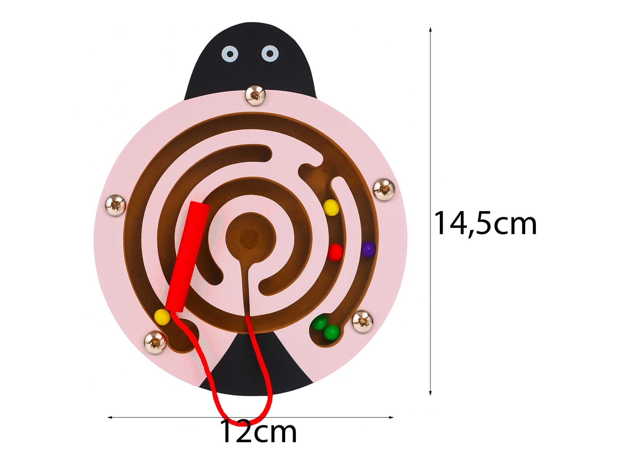 Zabawka została zaprojektowana z myślą o bezpieczeństwie Twojego dziecka. Przezroczysta szybka chroni elementy labiryntu, a wyszlifowane krawędzie zapobiegają wbiciu drzazgi, zapewniając pełne bezpieczeństwo. Patyczek z magnesem jest przymocowany sznureczkiem, dzięki czemu nie zgubi się podczas zabawy.