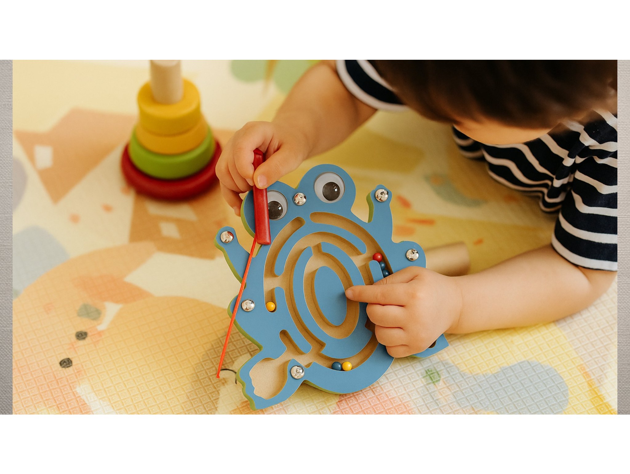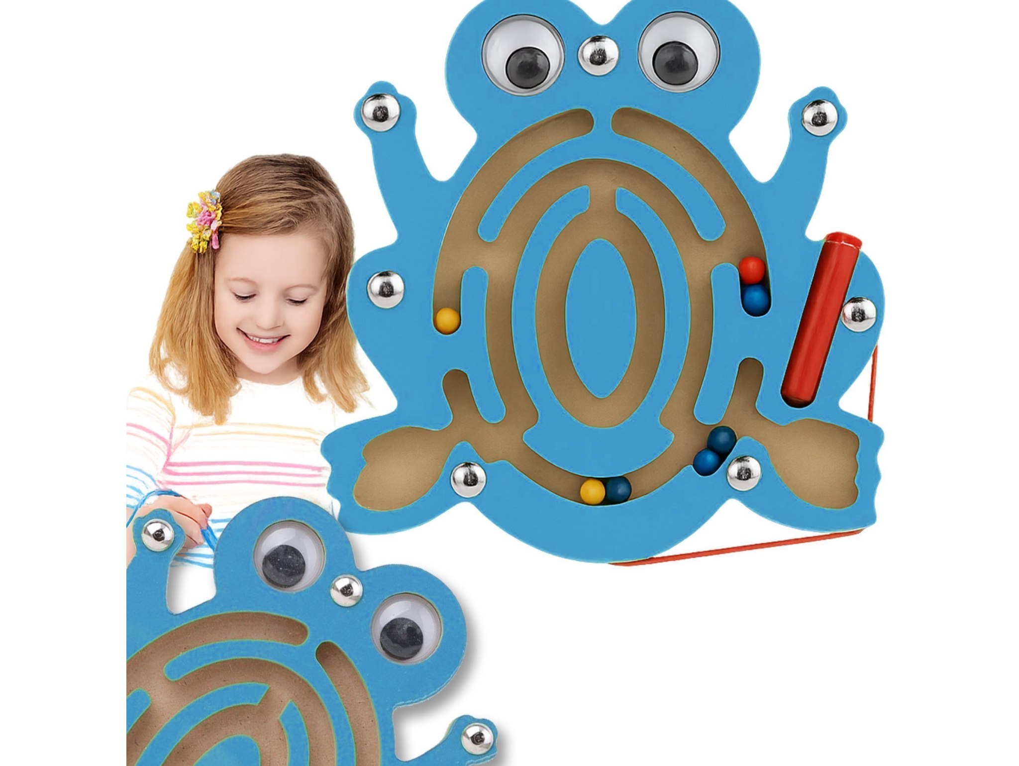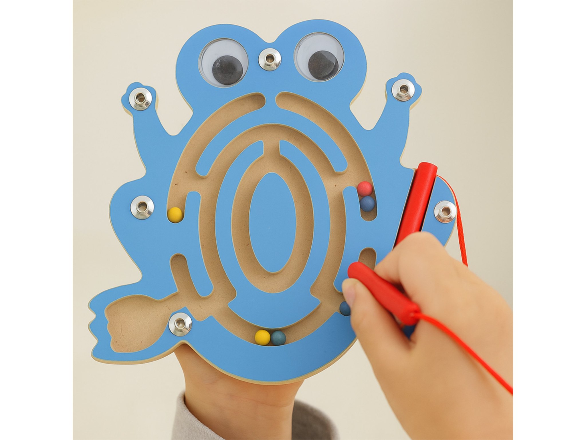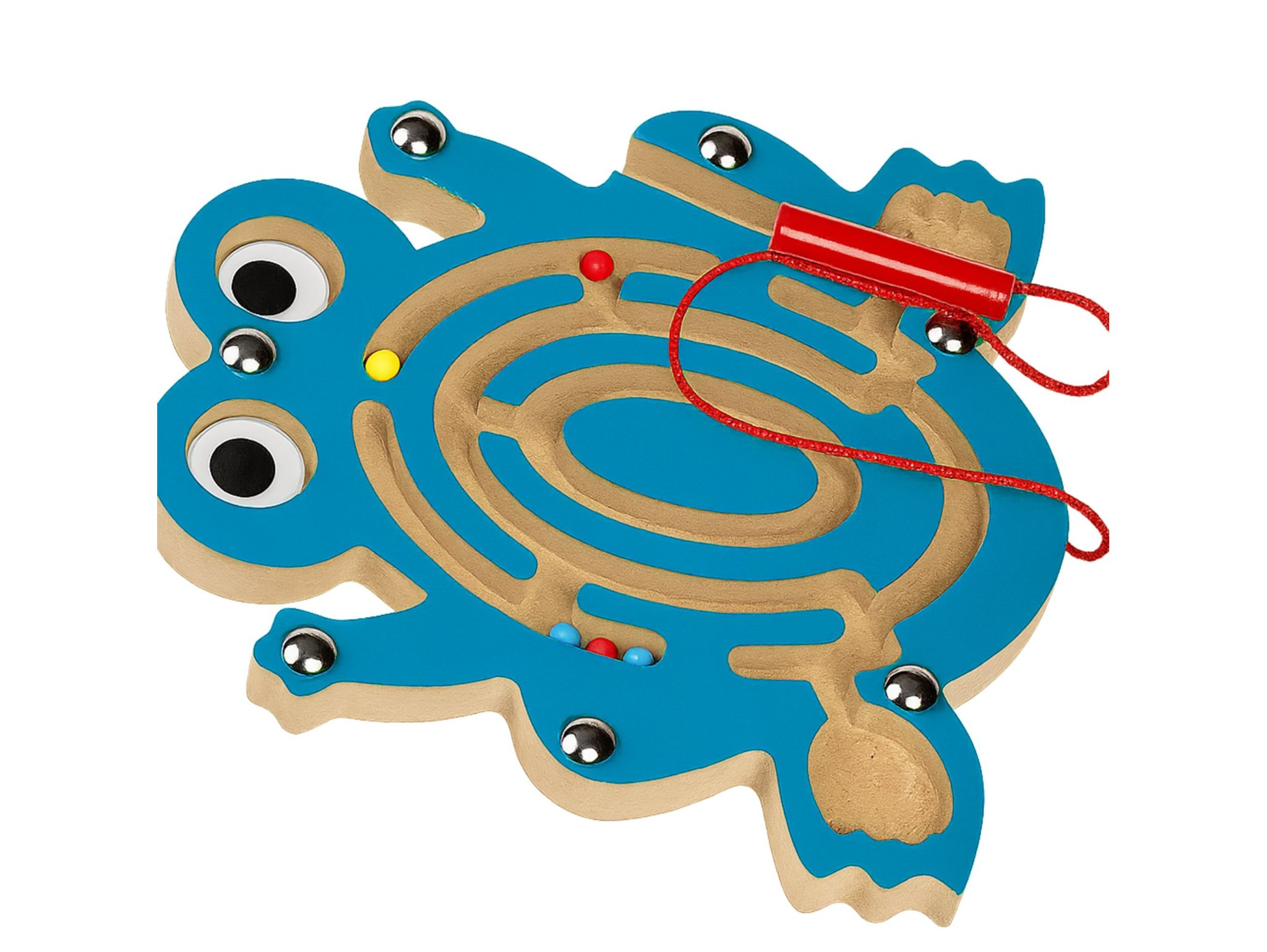 Zabawka została zaprojektowana z myślą o bezpieczeństwie Twojego dziecka. Przezroczysta szybka chroni elementy labiryntu, a wyszlifowane krawędzie zapobiegają wbiciu drzazgi, zapewniając pełne bezpieczeństwo. Patyczek z magnesem jest przymocowany sznureczkiem, dzięki czemu nie zgubi się podczas zabawy.