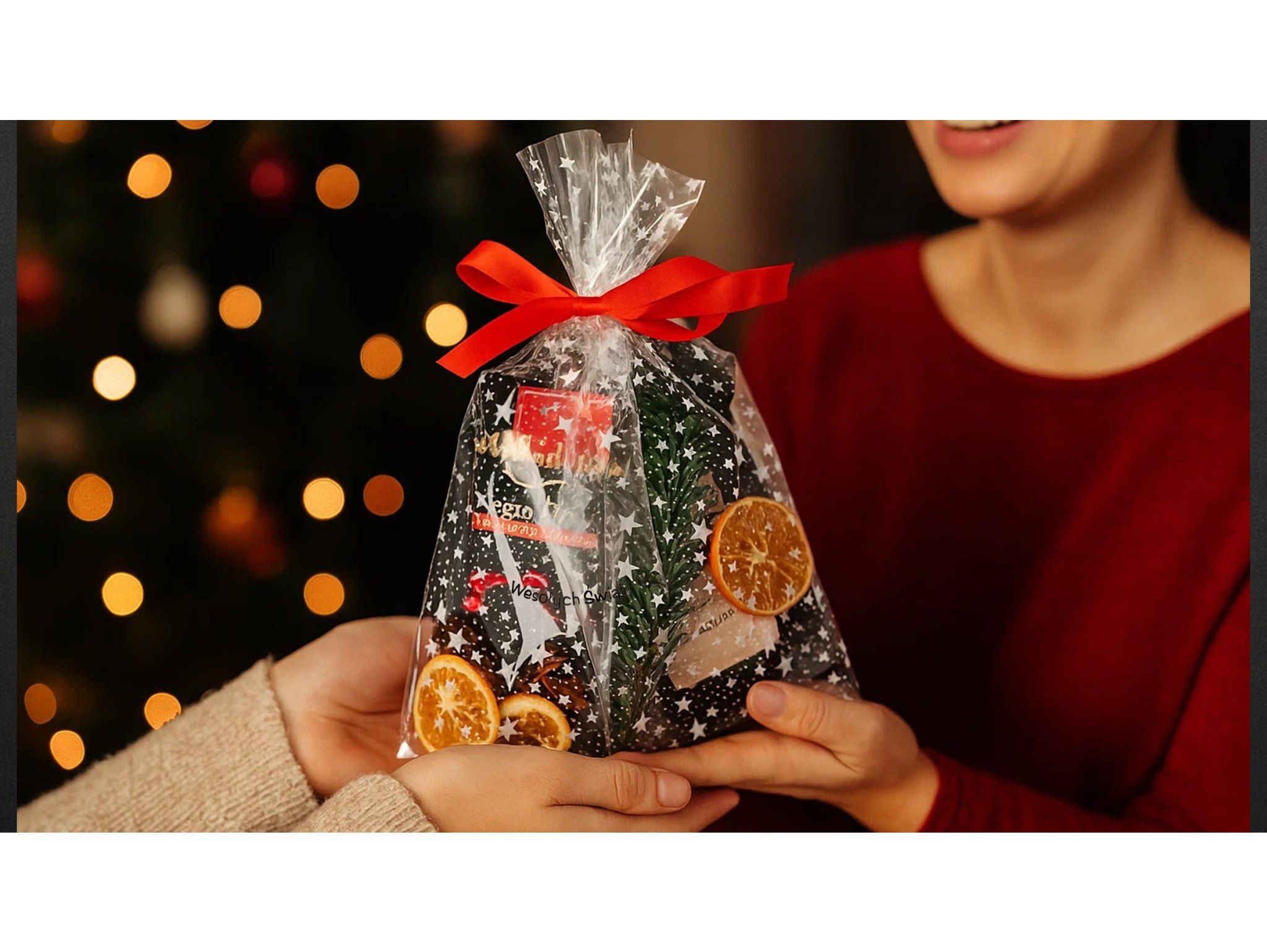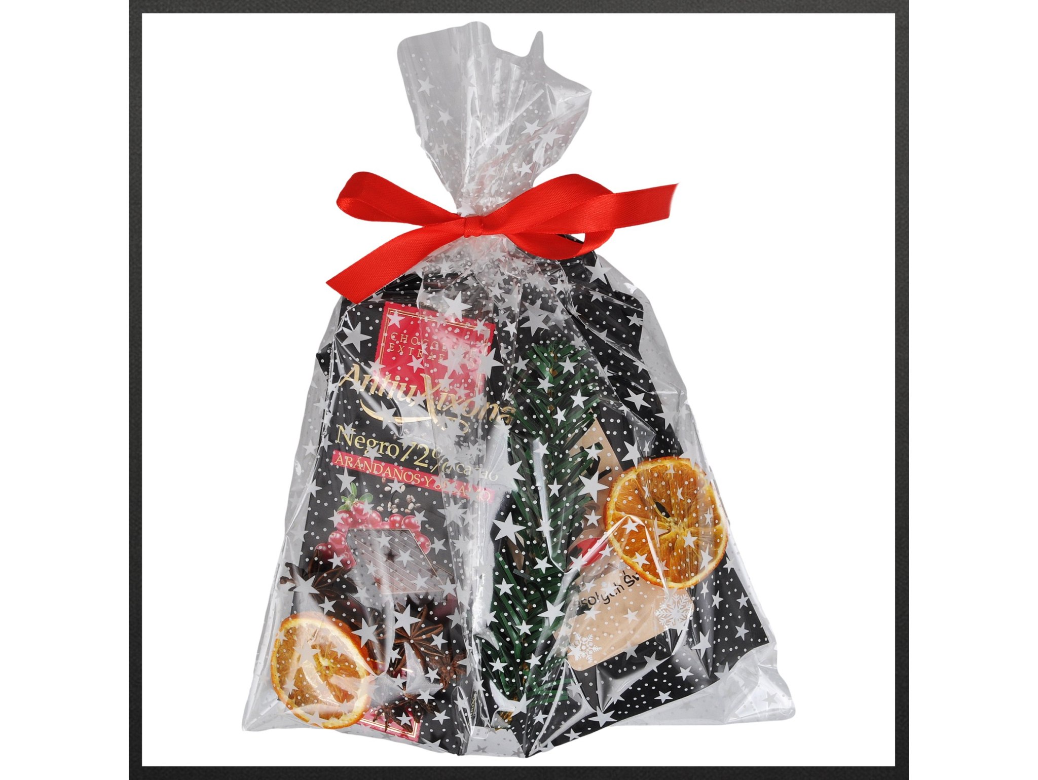 • Worek prezentowy z celofanu z dodatkami: plastry pomarańczy, anyż, gałązka świerku.